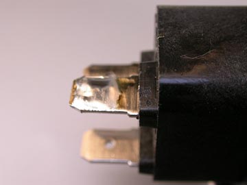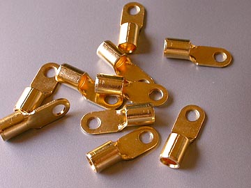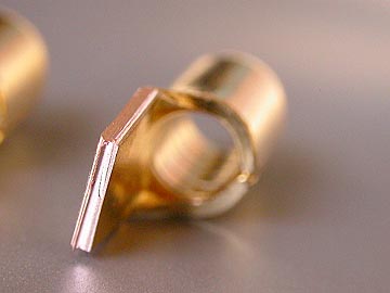 | TL8-M4R50の形状そのままではインレット電極にハンダ付けしにくい。IECインレットの端末と圧着端子をできるだけ広い面積で接合させてやりたい。そこで、インレットに取り付けやすい形状にするため端子を加工する。銅は柔らかいのでペンチで比較的簡単にカットできる。余談だが、TL8-M4R50は本来、カーオーディオのスピーカ−配線やアース配線に用いる端子。インパルスではオーディオテクニカ製の端子として売られている。インパルスの店員さん曰く、TL8-M4R50の材質は真鍮でしょう、と言っていたが、実際に切断した断面を見ると銅だった。銅は真鍮より電気抵抗が少ないので、音質的にも有利だろう。 | |||||||||||||