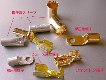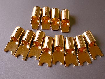 | 様々な構造的には、小さなインレット電極を挿み込めるような端子が望ましい。電極を物理的に挟み込めれば、ハンダ付け作業がやりやすいし、ハンダ付けも最小限で済むため、音質劣化要因を最小限に抑えられるためだ。スピーカ−ユニットへの配線に用いられるファストン端子がこれにあたる。これらの要点を総合すると、ケーブル適合径φ4.2の非磁性体ファストン端子があれば理想的。秋葉原を散策し、ネットで調べ、ホームセンターなども駆けずり回った。様々な圧着端子を掻き集めてみたのだが、私が想い描いているような理想的な端子は見当たらない。ファストン端子といえばトリッテック製のものがスピーカ−クラフト店で売られているが、大きくてもφ3.5までしかなので、これではφ2.0×3本を挿入できない。そんな中、これならなんとか使えそうだなという製品を見つけた。それが写真右上の純銅製金メッキ円型圧着端子。型番はTL8-M4R50という。もちろん、ケーブル口はφ4.5ある。\150/個と、一般的な圧着端子の4倍ほどもする。それもそのはず、普通のパーツ店で売られている圧着端子とは出来が違う。厚みもあって頑丈そのもの。これは秋葉原ラジオ会館4階のインパルスで売られている。インパルスはカーオーディオ専門店なのだが、端子類が豊富に揃っていて、私も時々お世話になっている。店員さんも気さくな方々ばかりで、とてもアットホームなお店だ。 | |||||||||||||