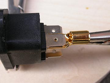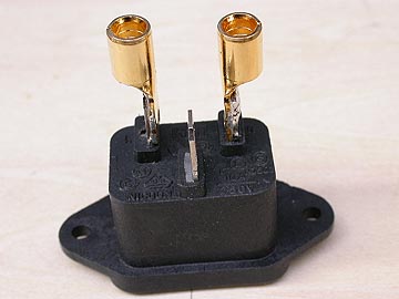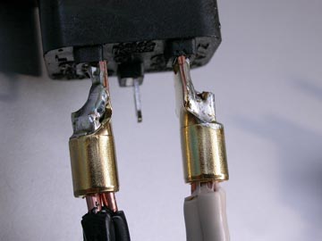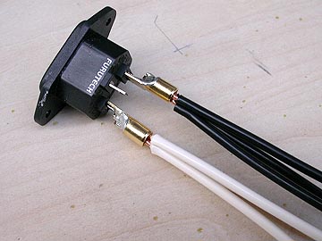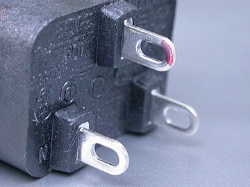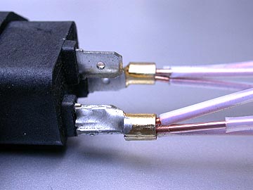| インレット電極にハンダ付けされた圧着端子。私は基本的にグランド配線はおこなわないことにしているので、真ん中の電極はいじらない。私がグランド配線しないのは、しなくても問題が無いからだ。最近どやこや言われている「グランドループを断ち切る」という観点からも、グランド無配線S/Nに有利だったりする。 | |||||||||||||
