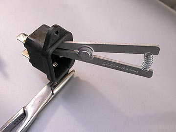 | さて、ここからは実際の配線作業だ。ニコオンのNC-174を例にとって説明しよう。まず、IECインレットを動かないように固定する。放熱クリップをハンダ付けする端子に鋏んでおく。ハンダの熱が溜まってケースが溶けてしまうのを防ぐためだ。内部電極にはあらかじめハンダを少し被せておく。 | |||||||||||||