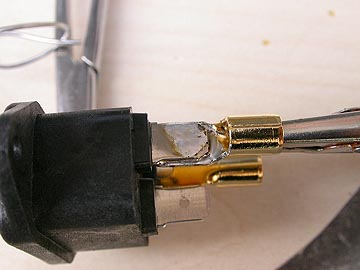 | 次にインレットを適正位置にあてがう。ハンダコテで数秒過熱し、頃合を見計らってハンダを付ける。ゴールドニッカスの使用感だが、銀ハンダ並みの融点らしく、決して融けやすくはない。綺麗に融かすには慣れが必要だろう。サーモスタット機能付きのハンダコテを使った方がよさそうだ。 | |||||||||||||