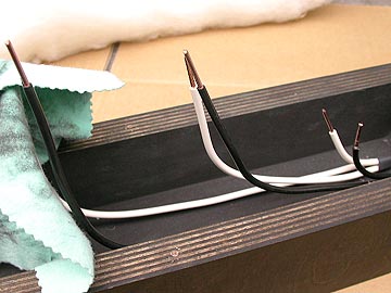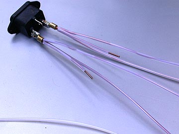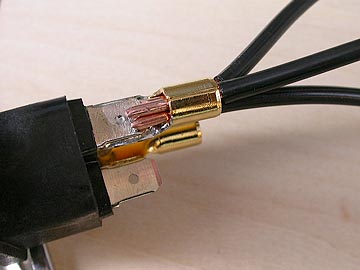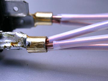 | ケーブル口にφ2.0単線を3本押し込む。そして、慎重かつ手早くハンダ付けする。あまり長時間ハンダの熱が加わると、ケーブルの絶縁材が溶け出してくるからだ。しかしながら、3本のφ2.0を綺麗にハンダ付けするには、接合部分をあらかじめきちんと熱しておかないとハンダが乗りにくい。ここらへんの見極めがなかなか難しい。やはり経験を積んで、コツを掴むしかない。なお、圧着ペンチによる圧着はおこなっていない。 | |||||||||||||