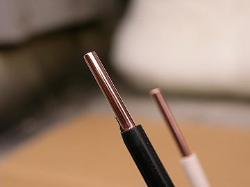 | PCOCC単線のハンダ付け状態もご紹介しておこう。要領は先に紹介したものと同様。今回使用したPCOCCはφ1.4。EM-EEF2.0に比べ線径が細いので、ハンダ付けも楽。ハンダ付け部分にはハンダの酸化物やヤニが残っている。これらは真鍮ブラシでササッと擦れば、写真右上のように綺麗さっぱり剥ぎ落ちる。 | |||||||||||||