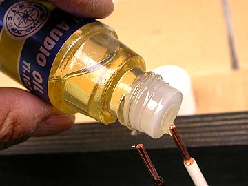 | ポリマールでピカピカになった端末。ここへさらにチタンオーディオオイルを塗布する。ポリマールで酸化防止できているから、わざわざチタンオーディオオイルを塗布しなくても良いのだが、せっかくだから塗っておこう。ただし、塗過ぎは禁物。塗り過ぎたら拭き取ってやろう。端末に直接たらしている写真を掲載したが、実際に使う際は綿棒などに含ませてから端末に薄く塗布した方がいい。チタンオーディオオイルに限ったことではないが、接点復活剤を塗り過ぎると逆効果になる。音がぼける気がするのだ。なお、数ある接点復活剤の中からチタンオーディオオイルを選んだのは効果うんぬんというより、液が無色だから。チタンオーディオオイルは効果があるので使っているのだが、手持ちのケイグ赤やセッテンプロも同様に効果がある。ただ、ケイグ赤は塗った部分が赤くなるし、セッテンは黒くなってしまう。セッテンプロを塗ると低域の出方が強まるので私は好きなのだが、ユーザーが黒くなった内部配線の端末を見て「なんだ真っ黒に汚れてんじゃねぇか!」と勘違いされても困る。だから、無色のチタンオーディオオイルにしておいた。もっとも、ケースを分解して配線を外してみないとわからないことなのだが。 | |||||||||||||