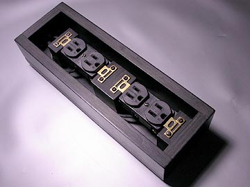 | この電源ボックスのケースは強化木という特殊な木材で出来ている。その他にも、内部配線は純銀線、ネジは全て制振合金、コンセントはSWO-DX×2個、プレートレスのスケルトン仕様、底板の四隅には真鍮製スパイクを搭載している。この電源ボックス自体は固有音が全くといっていいほど無く、コンセントの素性をありのままにさらけ出す性質がある。私の耳に馴染んでいる電源ボックスということもあり、比較試聴のリファレンス機にしているのである。ソフィーの声の通り伸びやか。さよならサックス伸びやか。抑圧感なく開放的。パーカション歯切れ良し。オコラは音像がやや奥に引き気味。弱腰に聴こえる。