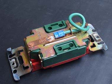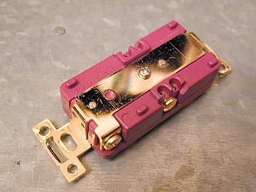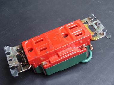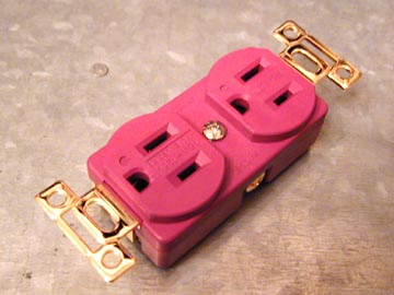 | 見よ!この美しい姿を!青い丸はホスピタルグレードを表わすグリーンドットマーク。ちょっと見えにくいが、三角マークもある。これはアイソレートグランドを意味する印だ。秋葉原では5362-Aのクリームとグレーは見かけるが、オレンジの5362-IGは見かけない。金具、ボディなど、外見はレビトン8300-IGと全く同じだが、5362-IGの電極はメッキ無しブラス材。 | |