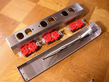 | さて、コンセントの取り付けにかかろう。配線は私の自作電源ボックスSaturnianMoonsの製作時に余っていたものをそのまま流用した。コンセントはUL規格品を使う。手元にたまたまレビトンの5362Rが3個余っていたので、これを使う事にした。5362Rはレビトンらしいプラグの食い付きの良さ。色彩的にもMT-USにベストマッチだ。音質は中堅どころで過不足無し。私は5362Rをヤフオクで格安入手したが、オーディオアクセサリーのネットショップK'sLabでは常時取り扱っているはずだ。なお、5362という型番には色違いやアースの落とし方などで数種類に細分化されている。詳しく知りたい方は、レビトン社のホームページにある製品パンフレットのPDFファイルを探し、ダウンロードしてご確認いただきたい。 | |