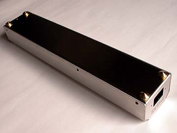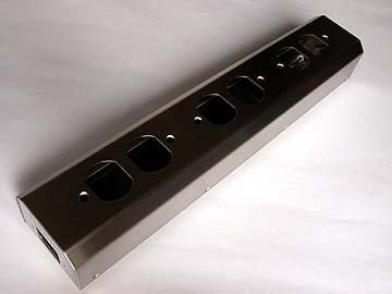 | これがMT-US。表面は鈍い銀色をしている。ステンレスの地肌そのままだ。片研磨ステンレス程度の表面光沢。これを完成品状態に仕立てたMTS-6という電源ボックスも同時期に発売されている。なお、MTB-6に使われているケースはMT-USではない。筐体素材とコンセントの固定方法が違うのだ。MTB-6に使われているケースは単売されていない。MTB-6のケースは真鍮製であるのに対し、MTS-6のケース=MT-USはステンレス製。素材としては真鍮の方が高価であるし、音質的にも有利かもしれない。MTB-6のケースが銀色に見えるのは、真鍮にニッケルメッキがなされているためだ。もう一点、MTB-6のケースは底面から延びる円柱状の棒にコンセントをネジ止めするのに対し、MTS-6のケース=MT-USではシャーシ本体へ直にネジ止めする仕様になっている。どちらが音質に有利か一概には言えないが、構造的にお金が掛かっているのはMTB-6のケースの方だ。そんなわけで、MT-USの安価な理由は、構造が単純であることと、メッキレス、シャーシ素材のコストが安いからであろう。 | |