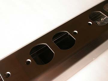 それはさておき、ULコンセントを3個内蔵出来る電源ボックスケース、つまり自作用6個口電源ボックスケースは数少ないのだ。MT-USのような、安価で作りのよいUL規格6個口電源ボックスケースの登場は、自作マニアにとって積年の願いだったかもしれない。少なくとも私はずーっと待ち望んでいた。私の知る限り、UL規格6個口電源ボックスケースの既存製品は、アコースティックリバイブのRCB-6、チクマのPS-2.3BOXくらいだった。ただし、この2種はオーディオ店でもほとんど在庫しておらず、入手は難しい。PS-2.3BOXはコンセント指示ポールが近接しすぎており、隣同士のコンセント金具がぶつかり合うという構造的欠陥がある。RCB-6はオヤイデ電気で入手可。アルミブロックの削り出しで、作りは素晴らしいことこの上ないのだが、35,000円と高額だ。UL規格6個口電源ボックスケースの裏技としては、コンセント3個搭載型塩ビケースにUL規格6個口コンセントプレートを被せると言う方法もある。これだと、数百円の塩ビケースに3,000円ほどのコンセントプレートで、安価な電源ボックスケースが構築出来る。ただ、UL規格6個口コンセントプレートは扱い店が少ないので、入手が困難。私が知る限りでは、ロビン企画、及びエンゼルポケット秋葉原店には置いてある。ヤフオクでも最近、ちらほら出品されているのを見かけるので探せば見つかるだろう。プレート以外にももう一つ問題がある。それは、塩ビケースのケーブル引き出し口が直出しを前提としている丸穴だということだ。そのままではIECインレットが固定できない。いさぎよく、電源ケーブル直出しに仕立ててしまうのが無難だ。どうしても電源ケーブル脱着式にしたい場合には、ケース側に何らかの改造を加える必要がある。おっと、ずいぶんと余談が過ぎた。話をMT-USに戻そう。 |