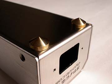 | MT-USの底面。四隅にはオヤイデ電気オリジナルの小型スパイクインシュレーターが取り付けられている。3カ所固定にも変更出来る。ご覧の通り、インシュレーターの素材は真鍮だ。このスパイクはもともと、新型OCB-1のケースに適合するよう、新型OCB-1のオプション品として販売されていたもの。 | |