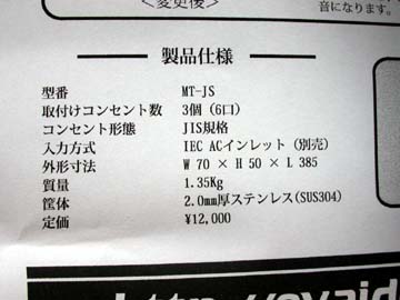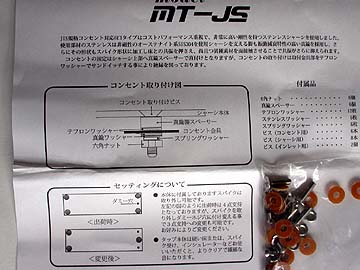 | 同封されていた説明書。なぜか、姉妹品MT-JSの説明書が入っていた。仕様的にはコンセントの切り抜きがJISかULかの違い以外は差がないので、MT-JSの説明書で事足りるということか。 | |