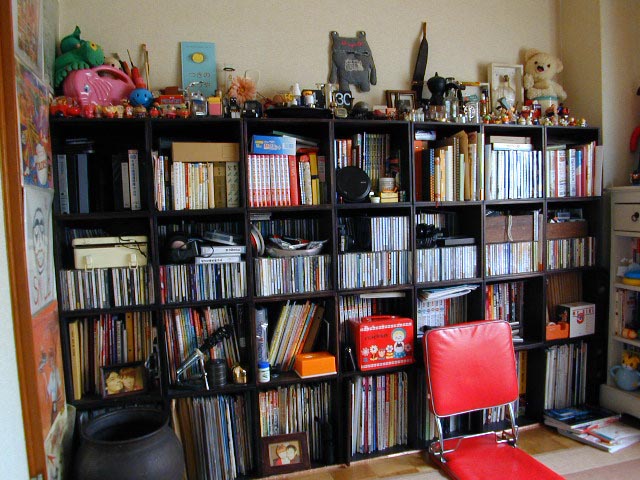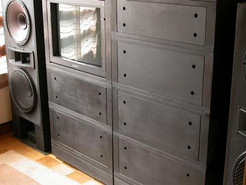 | これは子供のいたずら防止用の蓋を付けた状態。真っ黒な壁が部屋の一角を占領している姿は、私自身けっこう好いていた。自分がやりたいように設計製作した自作ラックたちだから、自分好みになって当然ではある。
