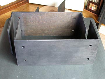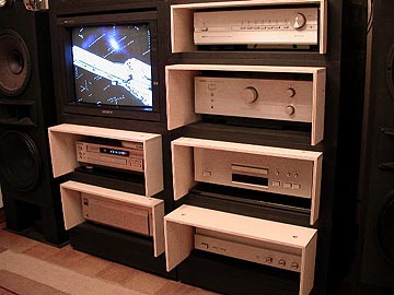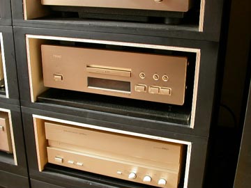 | さて、組み上げた蓋の着色手順を説明しよう。まず、320番の紙ヤスリで角を落とした後、ダークオーク色のオイルステイン(ワシン製)を3回塗り。さらに全体を600番くらいのフィニッシィングペーパーで磨き、艶消し黒のラッカースプレー(ハンズオリジナル)を薄く塗布。木目が所々うっすらと透けて見えるよう、スプレーはあえてムラが出るように吹き付けている。さらに1000番のフィニッシングペーパーでざらつきを取り去ると完成!制作時間はトータル9時間程。なかなか良い感じに仕上がった。いずれはこの蓋にも音質向上の機能性を持たせようと計画している。例えば、蓋の裏面にクリプトンのミスティックグレーを貼付け、ラック内部の定在波を減少させたりできないかと。 | |