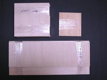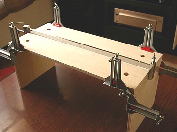 | これが製作中の蓋。構造はいたって単純で、3枚の板をコの字型に組み合わせただけ。板材は9mm厚シナ合板。カットは新木場のもくもくに依頼。カット精度は上々。丸い穴はボール盤を使って自分で開けた。接合には木工ボンドを用い、ハタガネで圧着固定。 | |