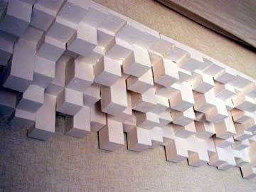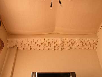 | いままでのシステムに追加した箇所としては、システム上面の一辺に自作音響拡散パネルを設置したことだ。素材は発泡スチロール。これを見てお気づきの方も多いと思うが、要するにQRDの拡散パネル“スカイライン”を真似てみたのだ。自分なりのアレンジは加えているのだが。なお、本家スカイラインも発泡スチロールで出来ている。この自作パネルの制作過程はオーディオ聖地巡礼記2005年8月7日号分 に掲載している。 | |