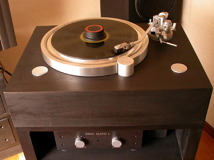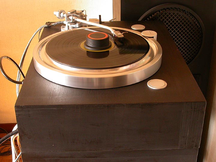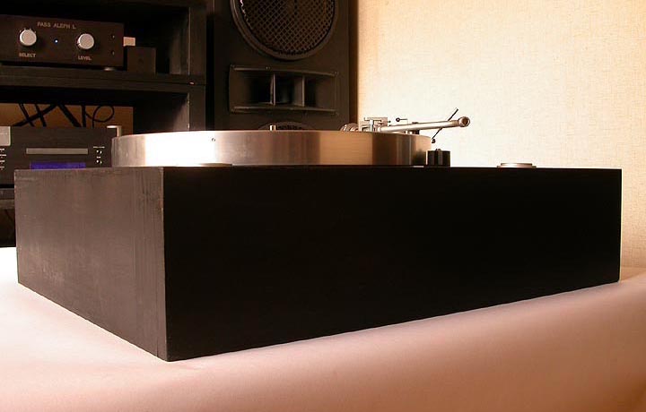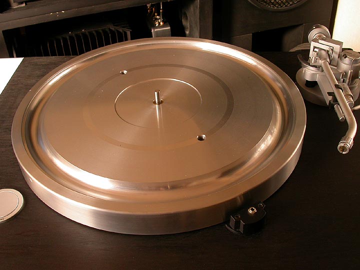 | GT-2000L改最終バージョンを上方から。ターンテーブルは33mm厚のアルミ。外周部にお椀状の凹みがある。私はやっていないが、この凹みにガラス粒や鉛粒などを流し込んでやると、防振効果が得られたりするかな。 | |||