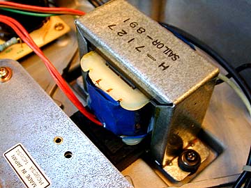 | タオックTITE-47Rを逆向きにつけている。TITE-47Rのネジ切り加工には下側の穴からネジを切った方がやりやすかったからだ。 | KP-07Mの電源トランス。手で触るとぐらついていた。片面粘着式のブチルゴムを隙間に挟み、ぐらつきを解消した。 |