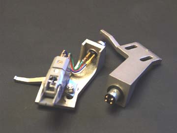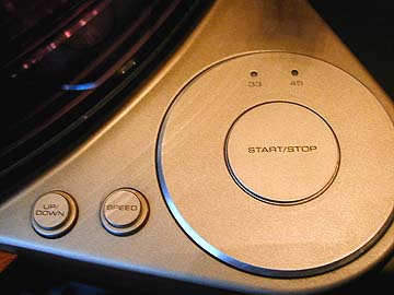 | 本体右側にあるスイッチ類。デザイン面からも機能面からもうまく配置されている。大きいボタンはターンテーブルの回転ボタン。小さいのは回転スピード切り替えボタンとアームのリフトアップボタン。アームのリフトアップは迅速だ。 | V-70という型番の付属カートリッジ。変更針はN-70という。シェルはKP-07専用。シェルのコネクター部分がユニバーサルタイプより小さいので、KP-07にユニバーサル式シェルは使えない。カートリッジは普通のMCやMMが使える。 |
