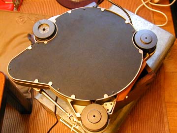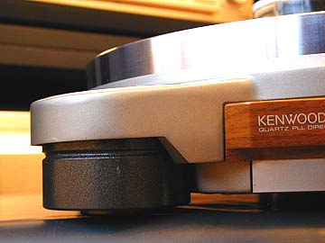 | KP-07Mの標準インシュレーターを付けたところ。銀色の化粧帯付きのプラスチックモールド製。直径70ミリ。プレーヤー本体はインシュレーターに内蔵されるバネとゴムによって強力にフローティングされている。 | KP-07Mのドーム型ダストカバー。かっこいいなぁ。ダストカバーは半透明のスモークブラウン色。インシュレーターをタオックのTITE-47Rに交換。床とリジッドに設置したおかげで、若干ながら細部の分解性が高く、低域の締まりが出た。 |