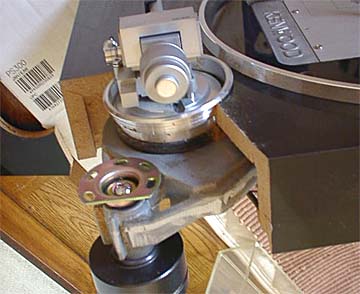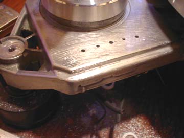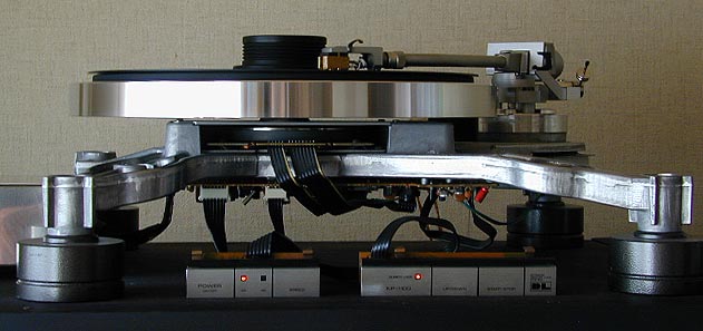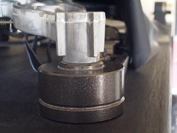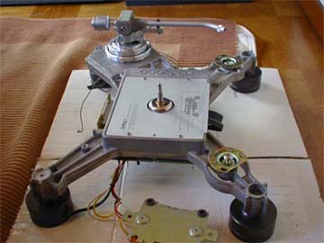 | TITE-47Rを取り付けた状態。なかなかぴったりハマっている。脚の剛性が増したため、付属品のインシュレーターに比べて細かい音までよく拾うようになった。ただ、ハウリング低減には効果がない。ハウリング対策には薄いクロロプレンゴムシートやJ1のシートをTITE-47Rの下に敷いてやると効果があった。右上は、試行錯誤の末ようやく完成したKP-1100スケルトン。うーん、メカメカしくって美しいなぁ。改造前と改造後の音質は極端な変化はないが、インシュレーターや配線の変更等によってやや情報量が増加したと思う。ま、私はたいしたレコードを持っていないので、手持ちの限られたアコーステック系ソースでの試聴なのだが。 | |