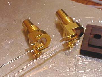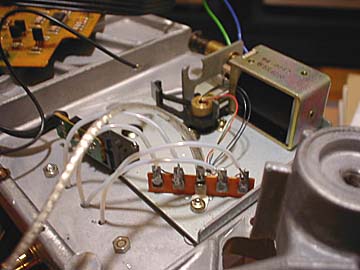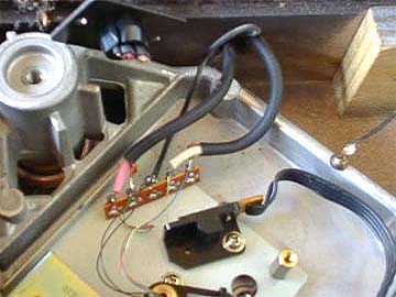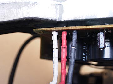 | トーンアームケーブルを脱着式にするには、RCAコネクターをプレーヤー本体へ固定しなければならない。検討を重ねた末、トーンアームの裏側のシャーシにコネクターを取り付けることとした。ケーブルを通すためシャーシに穴を開けた。RCAコネクターはWRT-0234 RCAコアキシャルソケットを用いることにした。こんな特殊な横向きコネクターを在庫している店はどこにもない。結局、木村無線で取り寄せてもらったのだ。写真ではホット側に銀単線をハンダ付けしたところ。 | |