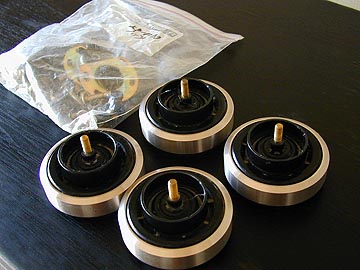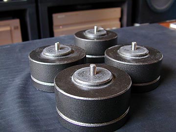 | 左は純正のインシュレーター。φ8ほど。銀色の部分はプラスティック。中にゴムが仕込んであるので、ソフト系のインシュレーターである。レコードプレーヤーのハウリング防止には役立つ。インシュレーターを回すと高さの微調整ができるようになっている。この純正インシュレーターはよくも悪くも付属品だし、見た目も安っぽい。スケルトンにするとインシュレーターもむき出しになるので、それなりの見栄えにしたい。もちろん、音質向上を兼ねつつである。そこで、私はTAOCの右上のTITE-47Rを使用する事にした。ただし、これはそのままでは取り付かないのだ。KP-1100のフレームへのインシュレーター取り付けネジはφ6ミリネジであるのに対し、TITE-47Rの中心に貫通する穴はφ5なのだ。だから、TITE-47Rの穴をφ7に拡張してやった。拡張にはボール盤を使用。これでTITE-47Rにφ6ミリネジを通て、KP-1100に固定させることができる。 | |