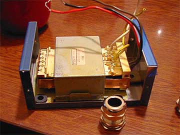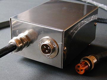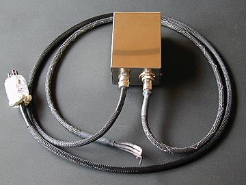 | 完成した電源トランスケース。ケースに穴を開ける際、手が滑ってリュータービットで表面に傷を付けてしまったが、それ以外はおおむね美しい仕上がりとなった。左のコネクターから延びるケーブル末端には明工社ME2573を使用。トランスの出力側はコネクター式にし、ケーブルを脱着できるようにした。 | |