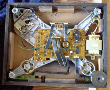 底板の薄板を外し、キャビネット下から覗く。キャビネットはパーチクル合板製だ。X型フレームの構造が良く分かる。基盤がむき出しになるので、以後の作業は慎重におこなう。 トーンアームを外さないとキャビネットの完全分離は無理。しかし、トーンアームを外すのはリスクを伴う。よって、キャビネットを切断して、ようやくX字フレームとの分離に成功。この頃使っていたデジカメはあまり性能が良くなかったので、写真がぼけているなぁ。