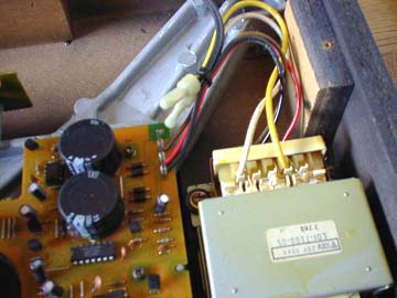 左上はキャビネットを外し終わったところ。それにしても奇妙かつ優美な形状だ。KP-1100のスケルトン化って音質に関係あるかは疑問。見た目がメカっぽくてかっこいいのがスケルトン仕様最大の恩恵。 右上はKP-1100のトランスの配線部分。電源ケーブルからトランスまで2芯、トランスからメイン基盤まで3芯で配線去れている。これらの結束を綺麗に切り離して、トランスをキャビネットから取り外す。