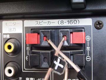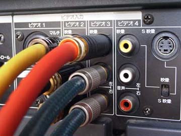 | KX-21HV1背面スピーカー端子。プロフィールプロはスピーカーを内蔵しておらず、代わりに外部スピーカー接続端子がある。このSP端子から真上にある自作スピーカーMX-21AV改へ音声を出力している。なお、MX-21AV改はマトリックス接続なので、特殊な結線方式となっている。 | KX-21HV1背面端子。VHSデッキHV-V7000、DVDレコーダーDMR-E10からの入力。プロフィールプロはテレビチューナー非内臓なので、DMR-E10のチューナーでテレビ放送を観ている。映像KX-21HV1+テレビ受信DMR-E10+音声2代目MX-21AV改でやっとテレビが観れるのだ。 |