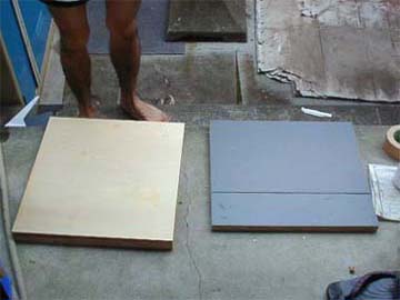| KX-21HV1の専用テレビ台、初代MX-20AV改。(右のラック)ダイトー製のF-77Aという7センチ防磁フルレンジを3発使用。 板厚は3センチ。ボール型キャスターを底面に搭載するなど凝った設計。ラック部分にビデオが2台入る。費用は3万程。2代目MX-20AV改の完成で、この初代MX-20AV改は現行ラックの完成にともない友人に譲ってしまった。 | プロフィールプロの収納ラック作成風景。ご覧のように、側板には防磁パネルが組み込んである。スピーカーの磁力によるモニターの変色を防ぐためだ。防磁パネルはエヌテックP45MK2という硅素鋼板。コイズミ無線で販売しているこの防磁パネルは非常に強力な防磁効果がある。これを3枚使用。1枚\5,000近くするので結構な出費。 |