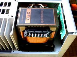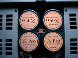 | 松下特製のX-Proツインキャパシタコンデンサー。容量は1200マイクロF×4。強固な外装保護ケースで4つ1組に固定。同じものは上位のセパレートパワーアンプにも搭載されている。 | 10万円のアンプにしては異例の巨大トランス。しかもシンメトリーに2台搭載されている。容量は300VA×2と強力な電源部だ。強力な電源部のおかげでSU-MA10は同価格帯最新アンプを優に超える音質を有する。 | ||