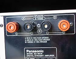 | 背面のデジタル入出力部。オプティカルはいらないから、同軸をもう1つくらい増やして欲しい。なお、端子は同軸、アナログともに金メッキではないものの必要十分な端子。とにかくこの内臓DACはS/N良く優秀。 | SU-MA10のスピーカーターミナル。AB2系統あり、前面スイッチでA/B/A+Bの切り替えができる。バイワイヤ接続も可。残念ながらバナナとYラグには対応していない。取り付けケーブルは3.5スケアまで対応可能。 | ||