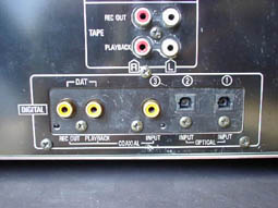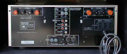 ![]() 背面もシンメトリー配置。アナログ入出力はAUX1、AUX2固定入力、TUNER、DAT入出力、TAPE入出力。中央下部にデジタル入出力があり、同軸入力2系統、同軸出力1系統、光入力2系統。AUX2の固定入力はアッテネーターパスのパワーアンプ部に直結されるので、使い方によってはパワーアンプとして使える。スピーカー出力はAB2系統ある。89年の製品なので電源ケーブルは直出し。ACアウトレットが3系統あり、1つはスイッチ連動、2つがスイッチ非連動。 |