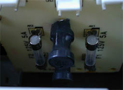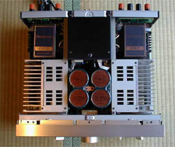 | 天板と側板を外す。振動に強い高剛性セパレートシャーシを採用し、ツインモノラルコンストラクション構造を有する。外見からもシンメトリー配置が分かる。10万円のアンプを超えた造り。 | 上の写真にある黒いパネルをはずし配線ケーブルを抜くと、ヒューズが見える。ヒューズはフルサイズのスローブロー5Aが二つ。クライオヒューズなどに交換すると良いだろう。 | ||