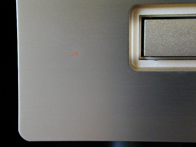 | パワーボタンの左ほどに微細な打ち傷が有るのですが、ちょっと離れると分からないくらいのものです。赤矢印のところに傷が有ります。ちなみにこの傷は購入時からついていたものと思われます。ただ、店頭で中古購入する際には気付きませんでした。光の当たり具合によって変化しますが、微細なので近付かないと分からないくらいの傷です。中古品なのでこの他にも極微細な傷があるかもしれませんが、私の目では見つけられませんでした。 | |