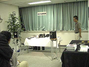 | 会場入り口。受付の方はとても気さく。大いに宣伝してください、って言われました。 | 47研究所で新型スピーカー試聴中。皆さん楽しそうに聴き入っていた。右の方が木村代表。 |