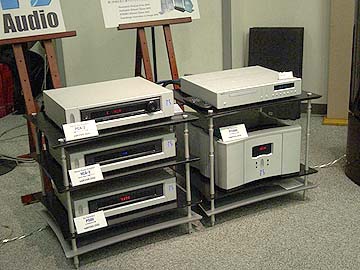 | 完実電気ブースにはPSオーディオの安定化電源がどっしりと構えている。ケーブルなども展示。 | コンバックコーポレーションではReimyoシリーズを陳列。Harmonix関連も展示。 |