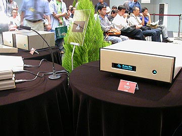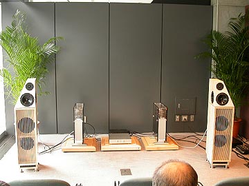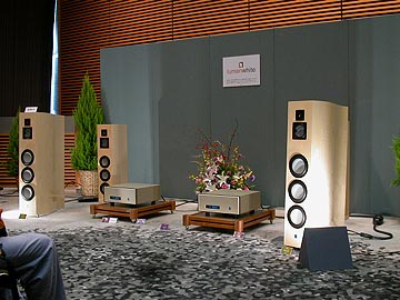 | ご存じルーメンホワイトのWhite Lightだ。昨年に引き続き今年も試聴をおこなっていた。雑誌で名が知れているものの、聴く機会なんてめったにない。White Lightの価格は300万円/本。だからだろう、試聴は満員御礼状態。私が訪れた時はちょうど柳沢功力先生のルーメンホワイトについての講演が始まるところだった。右の写真に映っているWhite Lightの後ろにはもう1台小さなルーメンホワイトが置いてある。これは、White Lightのジュニア版で、White flameというらしい。ジュニア版といっても少し小さいだけ。価格も200万円/本近くする。十数畳の部屋で聴くならWhite flameで十分だと柳沢先生はおっしゃっておられた。なお、アクシスでは今年からWeissというスイスのオーディオメーカーの製品を扱い始めた。White Lightの試聴にはWeissのCDプレーヤーが使われたのだが、講演の最中にWeissのCDプレーヤーがディスクを認識しないというトラブルが発生。急きょ、メリディアンのCDプレーヤーと取り替えられた。さて、音の方はと言うと、正直試聴エリアの範囲外にいたのではっきりしたことは申せないが、包み込むような柔らかさを兼ね備えた精巧な再生音といったものだろうか。もともとこの会場にはホールのような残響音が感じられるのではあるが。 | |||