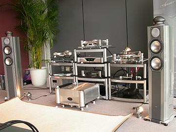| D5ホールはアクシスの展示ブースだ。このブースは部屋ではなく、天井の高いホールになっている。オーディオの再生空間としては東京国際フォーラムの中で最高だろう。アクシスはまさしくハイエンドの重鎮ブランドばかりを扱っており、FMアコースティック、ワディア、クレル、メリディアンが整然と陳列されている。写真に撮り損ねたが、ケーブルメーカーのトランスペアレントや、スピーカーのティールもアクシス扱いだ。しかしまー、FMアコースティックの数百万円という価格設定にはびっくり仰天だな。 | |||