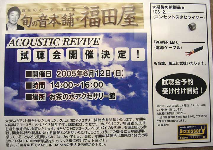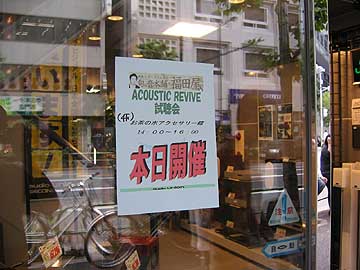 | オーディオユニオンお茶の水店の店頭に張り出されていた試聴会の案内チラシ。右は試聴用のシステム。オーディオユニオンお茶の水店4階奥に設置されていた。参加者はざっと30名はいるだろうか。立ち見参加者も多く、会場は大入り満員だ。私はあらかじめ予約しておいたので、最前列右端に陣取った。右スピーカーの真ん前だ。リスニングポイントとしては偏っているが、まぁいいだろう。