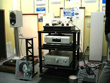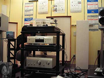 こちらは試聴システムの足下の様子。RIO-5やDSIX用強化電源DPS-1が置いてある。ユニオンオリジナル電源ボックスUN-AC1も見えるが、これはRIO-5やDPS-1の給電のため。DCD-1650AE/PMA-2000AEはラック背面にある電源ボックス(ラック背面のため製品名確認できず)から電力供給されているようだ。右は試聴用のスピーカー。ASWのGENIUS100。φ13ウーハーにソフトドームツイーターの2way小型バスレフ。H340/W145/D350と小型ながら、鳴りっぷりのいいスピーカーだ。ASWはドイツのメーカーで、ASWとはACCURATE SOUND WAVEの頭文字。GENIUS100もパシフィックオーディオが輸入しており、ユニオン系列各店で試聴できる。