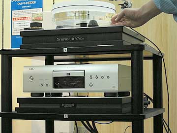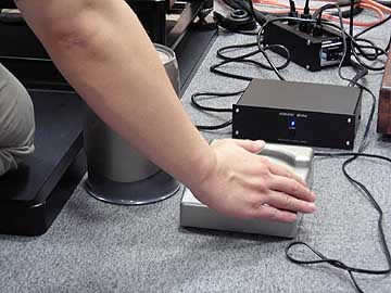 福田先生お話要約///あ、これ、水晶みたいじゃないですか。(福田先生の冗談まじりの質問に、石黒社長、水晶ですと即答。会場笑いに包まれる。)インシュレーターは物性の勝負ですから、オーディオ的にいかに良いものを探してこれるかですね。これ大きさは直径5cmで厚みは1cmですね。これ占いにも使えますか?(石黒社長苦笑いしながら“占いには使えません”と返答。)他に特徴は?/// 福田先生はけっこう気さくでユーモアのある方なのだ。試聴も半ば過ぎ、参加者はそろそろお疲れ気味。こんな時、福田先生は笑いで会場に景気づけをされる。石黒社長曰く、水晶は石材系としては硬くないとのこと。アコリバの社員さんがもう一人出てこられて、天然水晶について説明を始める。曰く「人工水晶は、水晶の粉に石英の粉を混ぜて焼いて作るので、透明で奇麗ですが音質的には天然が上です。天然水晶は水の結晶なんです。だから水晶と言うんです。天然水晶には結晶構造があるため、これが音によく作用します。天然水晶は今日より明日、明日よりあさってと、使えば使うほど良くなっていきます。」・・・よく分ったようなわからないような説明だ。 さて、試聴は女性ボーカルもの。これも福田先生持参のCDだが、詳細は控え忘れたので不明。まずは、現在の状態で試聴。次に、RIQ-5010をDCD-1650AEのインシュレーターとオーディオボードの合間に挿み込む。右写真はRIQ-5010を挿み込んでいるところ。 実はこのRIQ-5010、私も使っている。これを使うと音楽が有機的になり、艶かしい雰囲気を醸し出すことを経験している。雑誌の評価通りに自宅でも再現された希有な例だった。さて、この試聴会ではどういう変化を感じ取れるか・・・やはり同じ変化の方向だ!いままで気づかなかったざらつき感や歪み感が解消されたよう。変化してみて初めてわかることだ。音楽全体にトロみがついてくる。好き嫌いがあるかもしれないが、大部分の人はこの変化を好ましいと感じ取ることだろう。 福田先生評要約///はい、これはどうですか。一変しましたね。ウォームというか、人間臭いというか、これだけで全然違うCDプレーヤーになっちゃいましたね。ただ、オーディオ機器の設置に関しては、インシュレーターを使う前に、やっぱりきちんとしたオーディオボードを敷くことですね。まず、オーディオボード、次にインシュレーターです。今日はJ1の高級ラック使ってます。でもやっぱり、オーディオボードは使った方がいいですね。どんなに良いラックもオーディオボードほどの効果を併せ持ってませんから。機器のセッティングで皆さんあれこれ悩むと思いますが、まずはきちんとしたオーディオボードを使われることが、もっとも早いアプローチになります。/// |