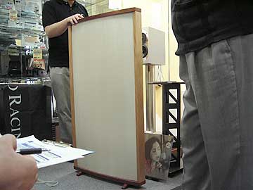 | 試聴その1.アコースティックコンディショナーパネルRWL2 福田先生のお話の要約///さて、まずはルームチューンパネルRWL-2ですか。皆さん、最終的に耳に届くのはスピーカーからの音じゃないんです。部屋の壁に反射して耳に届くから、ルームチューンというのはとても重要なんですね。このパネルに張ってある布材、この材質でものすごく変わってくるんです。これはシルクですか。これがポイントです。試聴するソフトの空間の響きが、如何に奇麗に出るかですね。/// このような前振りにて、まずはRWL-2を裏返した状態で試聴。試聴ソフトは福田先生が持参されたtheBというアカペラグループのCD。XUXUというアルバムの8曲目。美しい女性ボーカルだ。そつがなく奇麗に表現されている。ラックやボードも含め、きちんとセッティングされているから、それなりの音が出るのは当然だ。 さて試聴ソフトを1分弱聴き終えた後、RWL-2を表向きにする。RWL-2はラック背面に1枚、スピーカー背面に各1枚の計3枚。設置後、同じ曲を聴いてみると・・・存在感が増し、音量も少し上がったように聴こえる。声が少し前に張り出してくる。空気感がたしかによく出ている。奥行き方向の表現が増したとも言える・・・私はそう感じた。 福田先生評は///ノイズ感が減ったと思います。空間表現が良くなっていますね。こういうパネルは適当な枚数があって、ただ増やせばいいというものではないんですね。必要以上に増やしてしまうと音がやせてきます。伝々/// |