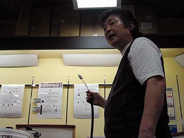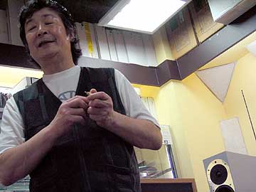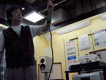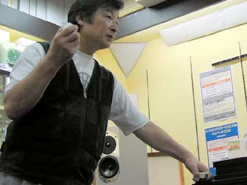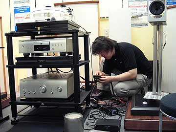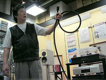 福田先生のお話要約///最近は各社、こういう箱を付けてきてますが、DSIXは先駆けですね。ここ(箱)にはデジタルアンプが入っているんですよ。これではアナログ的にパルスの立ち上がりを改善します。5パラの高速アンプが入ってます。アイソレーショントランスも内蔵されていて、ノイズを遮断しています。これ(DCD-1650AE)はトラポとして使ってます。(みじんこ注:JOBのDIGPREが置いてあるので、これをDACとして使用しているようだ)/// まず、ノーマル状態で試聴。ノーマル状態のデジタル同軸ケーブルの品名は不明だが、遠目から見る限りでは、ケーブルは細い水色で、自作っぽい作りの安っぽいケーブルだ。ソフトはヘンリーマンシーニの何かだったと思うが。DSIXに変更後、たしかに明瞭感が増したようにも思う。ただ、雑誌などでの絶賛評価をよく目にしていただけに、もっと激変するかと期待していたのだが、変化量は微妙だ。 福田先生評の要約///ワイドレンジなソフトなのですが、非常に切れが良くなりますね。僕もCDRに録音する時なんかにもこれ使います。CDRへの録音というのは、きちっと整備すると、元のCDより音を良くするというのは可能なんです。/// 試聴その5. RCAケーブルRCA1.0F(1mペア)+スピーカーケーブルSPC-F 続けてラインケーブルとスピーカーケーブルを試聴する。 福田先生お話要約///ケーブルというは普通、細い線を何本も撚り合わせて出来ていますね。だいたいφ0.18mmとかを何十本か集合させたりしているんですが、これだと不連続な構造が出来上がるんですね。これは音に悪影響が出る。アコースティックリバイブはこの撚り線の問題を単芯で排除したんです。後は端子が勝負です。ケーブルが100%じゃないです。プラグが30%くらい効いてますから。今日は私が愛用しているオーディオテクニカのロジウムメッキを装着してます。単線は表皮効果があるとか、電気の教科書に載ってますが、全然そんなことはないんです。高音もきちんと淀みなく出るんです。単線が駄目なら、Fケーブルの音がなぜ良いのかということになるんですね。それと今日は私の自作のアダプターを使ってます。これはオーディオアクセサリー誌でも紹介したものですが、簡単にバイワイヤリングできるようにしてあるんです。ウーハーのコイルは音を発すると同時に発電もしていて、これがツイーターに回り込むと悪さをするんです。これをバイワイヤリングで取り除いてやるんです。皆さんもバイワイヤリングやってみてください。試聴ソフトは現在発売中のオーディオアクセサリー誌の付録CDです。もう少しレンジが広いといいんですけど、良い曲です。/// オーディオアクセサリー誌の付録CD16曲目を使用。交換前のスピーカーケーブルは結構太めの透明シースの平行2芯タイプだ。ラインケーブルは不明。これをアコリバRCAラインケーブルRCA-1.0F+スピーカーケーブルSPC-Fに交換すると・・・刺激感が少なくなったように感じ、より滑らかになったかな。私は激変とまでは感じなかった。 福田先生評要約///大きく変わりましたね。いままで色々換えてきたところで、ネックになっていたところを一挙に交換しましたから、変化量は大きいです。RCAケーブルもプラグが30%くらい(音質に)かかってきます。このケーブル(アコリバRCA-1.0F)はロジウムプラグです。これはクライオかかってるんですか?( 石黒社長曰く、クライオしてますとのこと)/// |