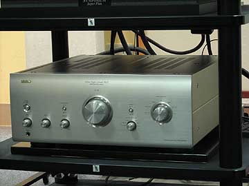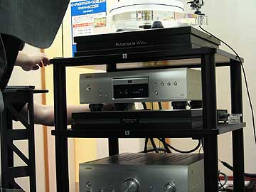 | 松浦さんに続き、デノンのコンシューマーマーケティングの中村さんが試聴機器の説明をおこなう。こちらが試聴用の機器。公の場ではこれが初お披露目となるデノンの新型SACD/CDプレーヤーDCD-1650AEとプリメインアンプPMA-2000AEだ。今回の試聴会用に最終テスト機を持ち込んだとのこと。DCD-1650AE/PMA-2000AEともに定価\157,500で、来月7月に発売とのこと。どちらも10年以上脈々と続くシリーズだが、このAEバージョンからデザインが一新された。DCD-1650AEは評論家宅でのテスト試聴を終えたので、これから音質部分の最終追い込みに掛かるらしい。デザインはご覧の通り、上級機のデザインを踏襲している。DCD-1650AEはSACDに対応したことと、上級機のアドバンスドAL24プロセッシング回路を搭載していることが大きな進化。PMA-2000AEは前バージョンPMA-2000|Vに比べ、プリアンプ回路のローノイズ化を徹底しているらしい。Phonoイコライザー回路ももMC/MM両対応となっている。ラックはJ1プロジェクト、オーディオボードは LPプレーヤーとDCD-1650AEに米国SYMPOSIUMの極厚ボードULTRA PLATFORM及びSUPER PLUS、PMA-2000AEにはBDRのTHE SHELFを敷いている。SYMPOSIUM/BDRともにオーディオユニオンの別会社パシフィックオーディオの扱い品だ。 |