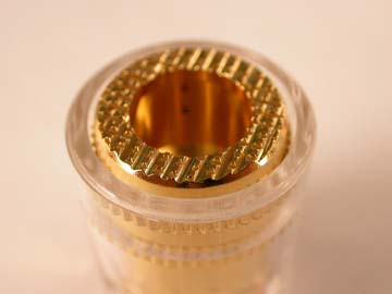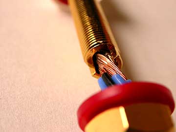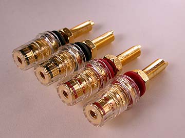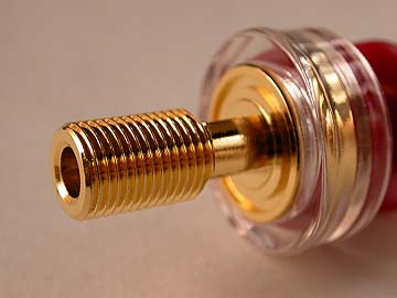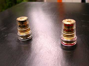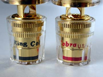 | この大型ターミナル、使うのがもったいないくらいに作りがいいですぞ。KingCobra U.S.Aとあるので、米国産ということだけは分るが、詳細なブランド名は不明。素材の詳細は不明だが、真鍮の金メッキがけと思われる。ケーブル固定クランプは左写真をご覧の通り、透明樹脂で覆われており、プラスマイナス配線の接触事故の危険性が少なくなる。内部配線はハンダ付けする。ターミナルの先端に開いた穴に内部配線を突っ込み、ハンダ付けするのだ。個人的には、ターミナルへの内部配線取り付けは、ハンダ付けに限ると思っている。ネジ止めだと、経年によりネジが緩んで配線が外れてしまうこともありえるからだ。スピーカーは振動を発する装置だけに、他の機器に比べてもネジの緩みが生じやすいのである。 | |||