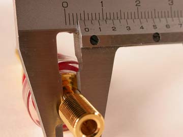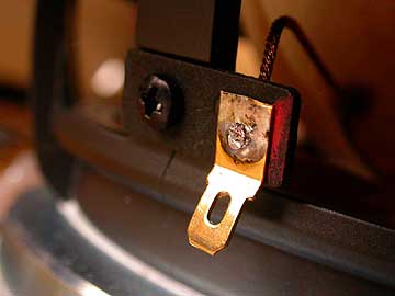 | こちらはFE168ESのターミナル。真鍮製と思われる。ここに4TCを直づけしてもいいのだが、4TCはしなりのあるケーブルなので、配線の状態によってはハンダ接合部に負荷がかかり、下手をすると外れてしまうかもしれない。そこで、耐久性と確実な接合を得るために、スピーカーターミナル用のスリーブを使う事にした。これはキムラ無線やコイズミ無線で売られているユニットターミナル用圧着スリーブだ。真鍮に金メッキ。たぶん、トリテックのものだったと思う。ケーブル差し込み部分の口径はφ4.5で、5.5スケア導体まで差し込めるようになっている。 | |||