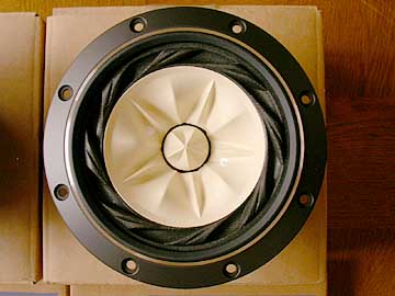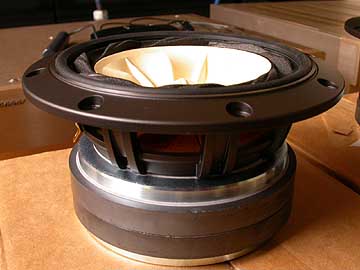 | FE168ESを正面から望む。UDRタンジェンシャルエッジの特殊形状がよく分る。なお、真正面から見る限り、この限定ユニットFE168ESと現行ユニットFE168EΣは全く同じ形状をしている。FE168ESとユニットFE168EΣを見分けるには、マグネットが2枚重ねであるか否かを調べるしか無い。右はFE168ESを横から眺めたところ。鋳物成形の強靭なフレームを有していることが見て取れる。 | |||