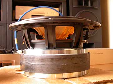 | エンクロージュアにPリングを取り付ける。Pリングとエンクロージュアの接合には右写真中の長い方のネジを用いる。このネジは爪付きナットとセットで、マキゾウさんから購入したもの。エンクロージュアに埋め込んだ爪付きナットのおかげで、Pリングとエンクロージュアを極めて強固に固定する事が出来きた。これは作業したものだけが感じる感想なのだが、爪付きナットはいいですぞ〜。ま、爪付きナット自体は別に珍しいものでもなく、ホームセンターやコイズミ無線で容易に入手出来る。爪付きナット+ミリネジによるユニットネジ止め固定には様々な発展が考えられる。例えば、M5のセイシンネジなんかを使う事も出来るわけだ。お金は掛かるけど。M5のチタンネジなんかが入手出来れば、音質面にかなり好影響を与えそうだが、M5のチタンネジってあるのだろうか。短い方のネジはPリングに付属していたもので、これはPリングとFE168ESとの結合に用いる。FE168ESに付属の木ネジは使わない。 | |||